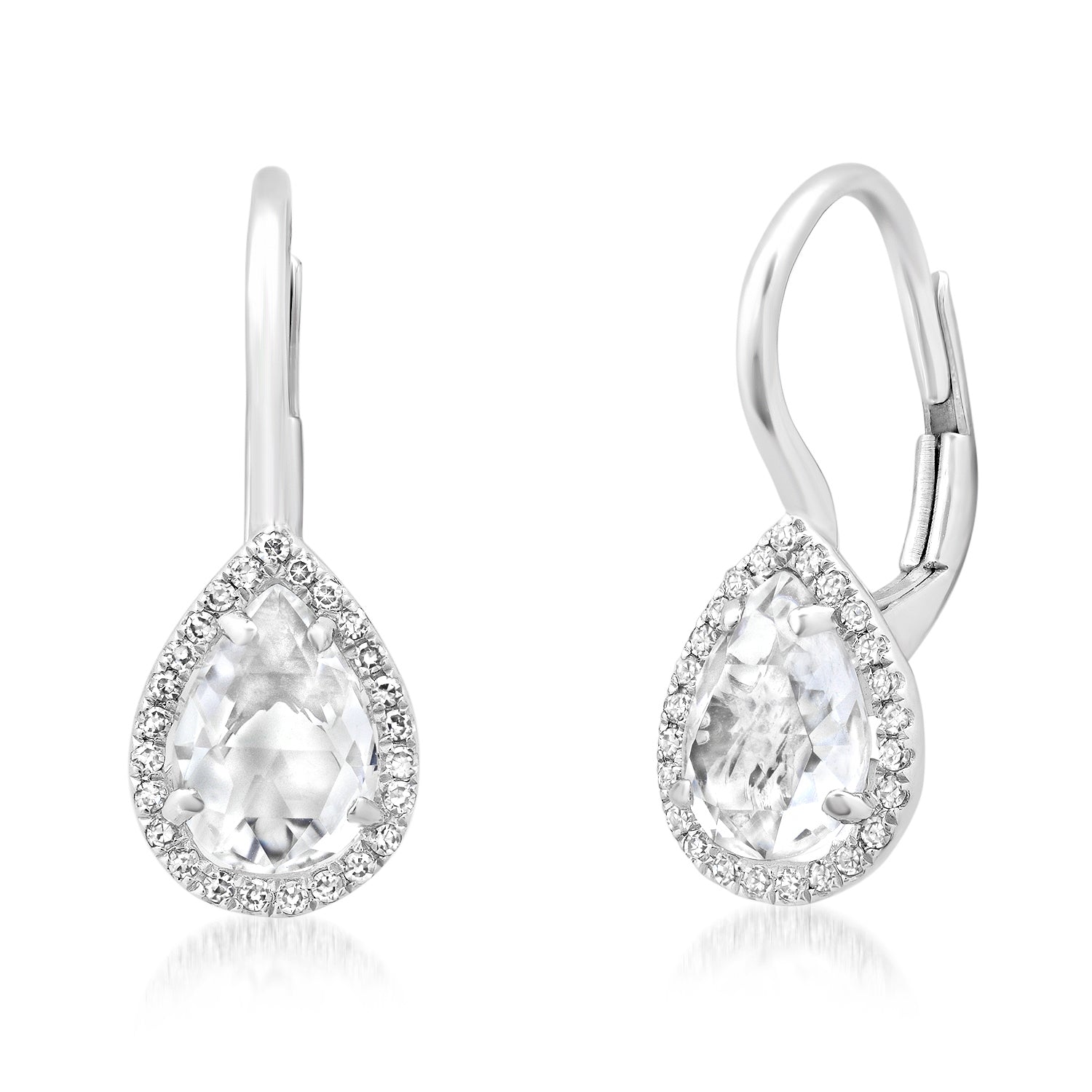 Pave Diamond Halo Pear Shape White Topaz Drop Earrings