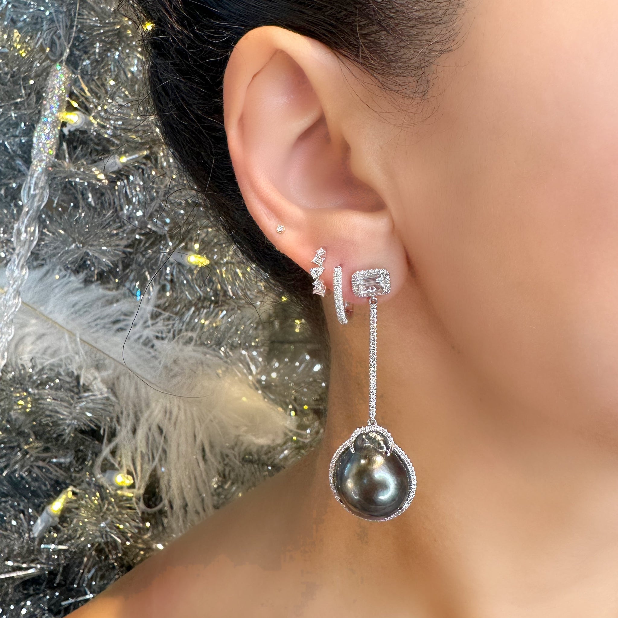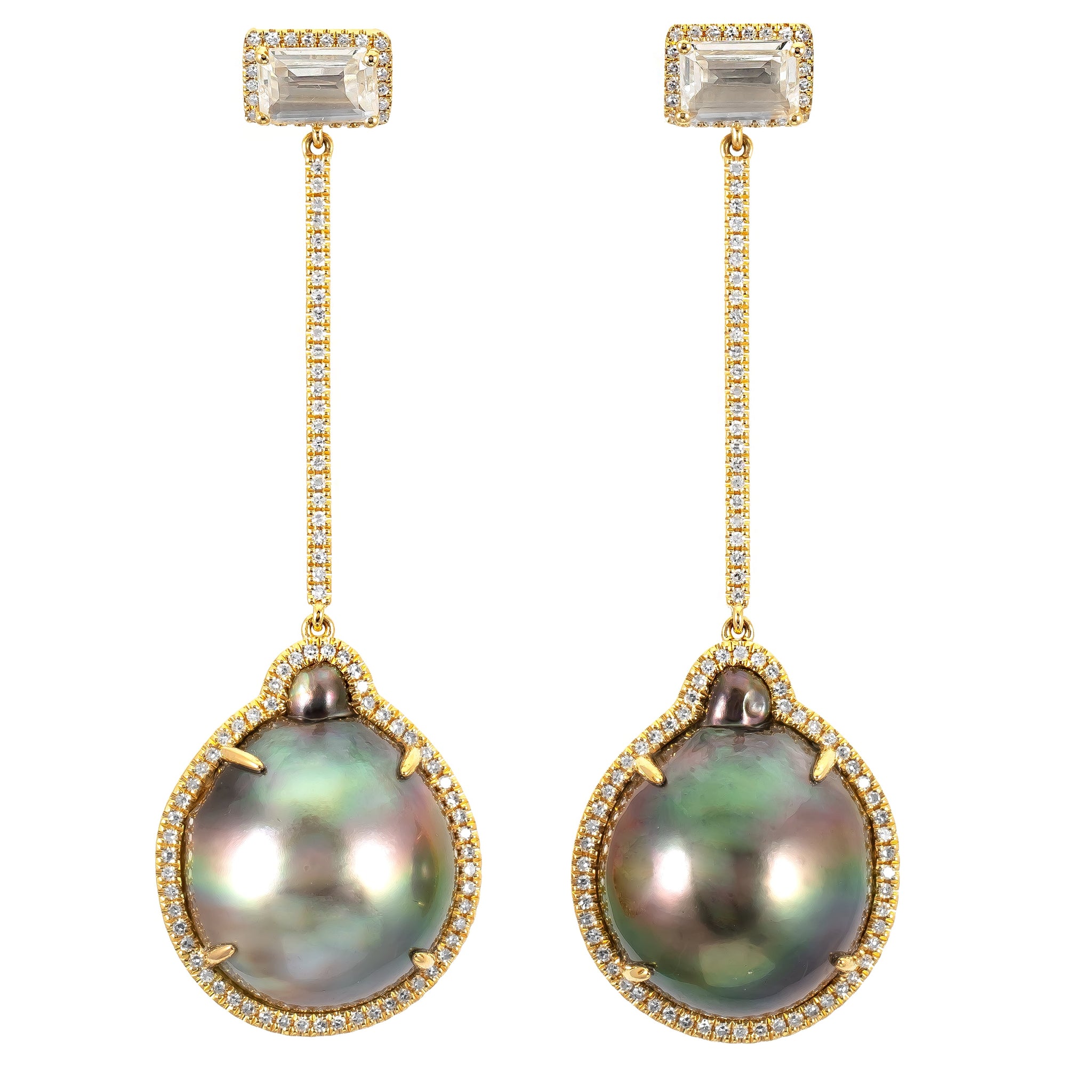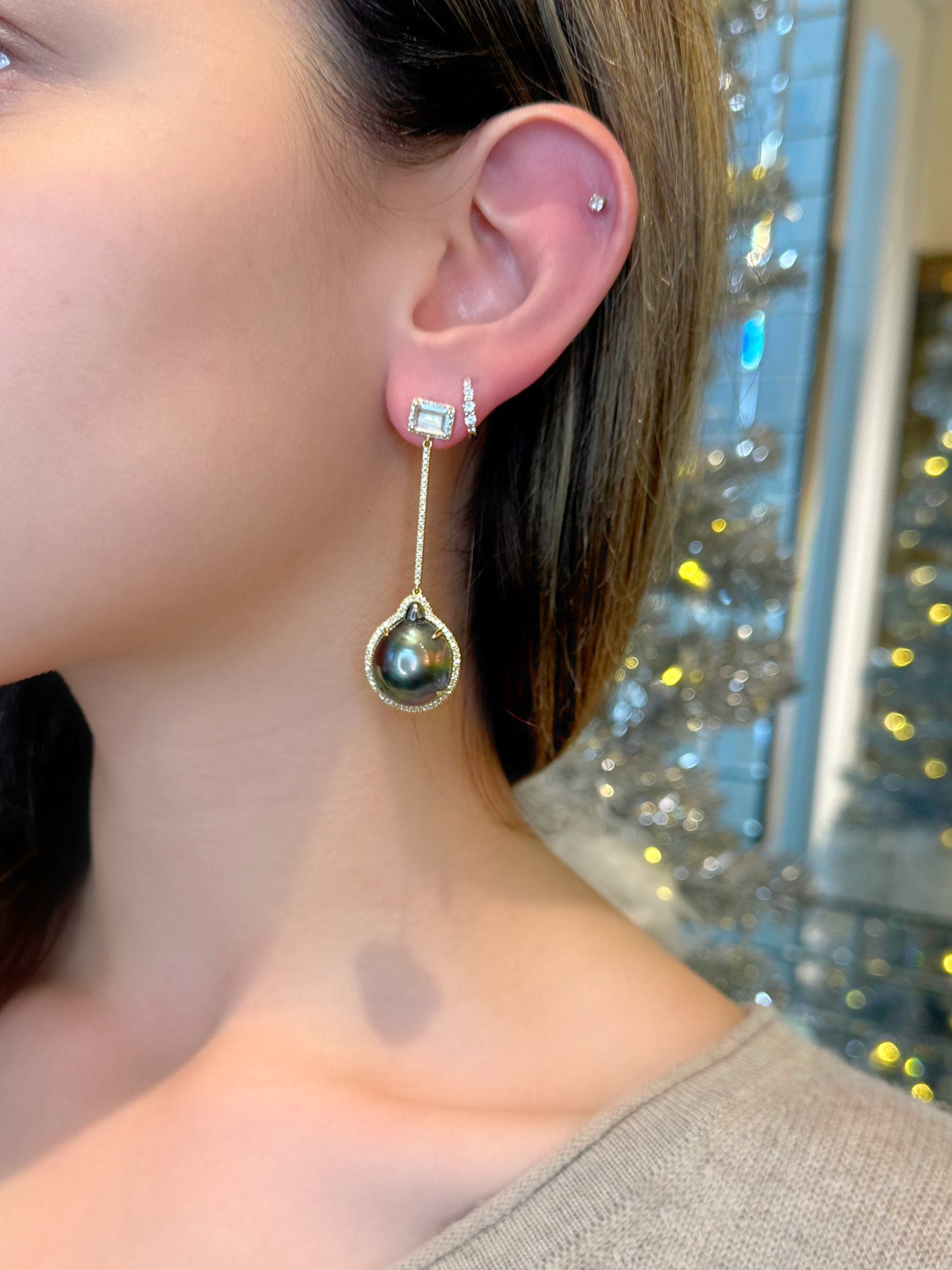 Baroque Tahitian Pearl Slice Diamond Halo + Line Emerald Topaz Drop Earrings