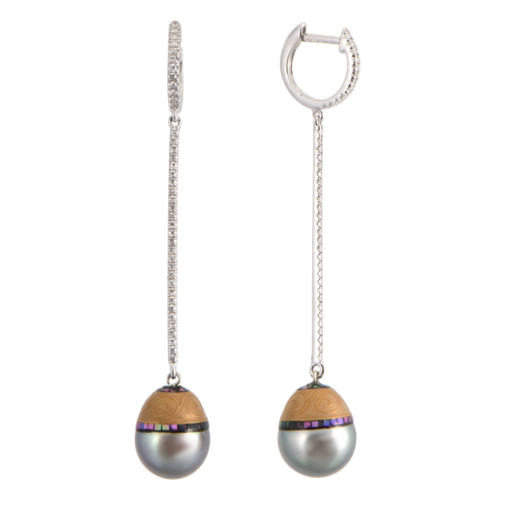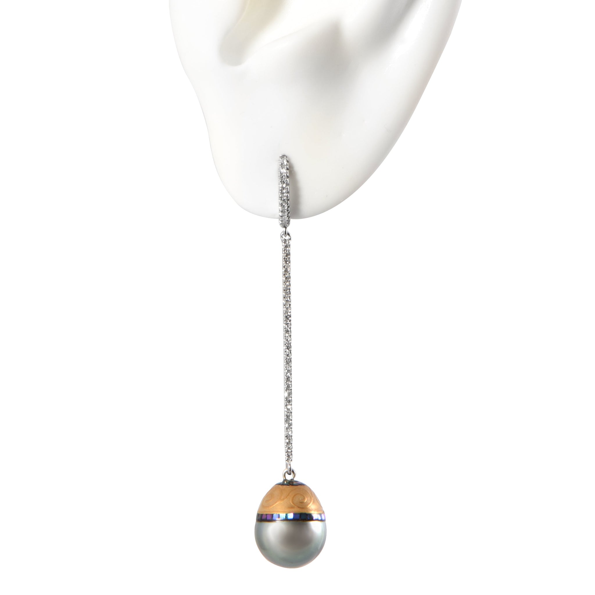 Tahitian Pearl Painted Mosaic Inlay Pave Diamond Line Drop Earrings