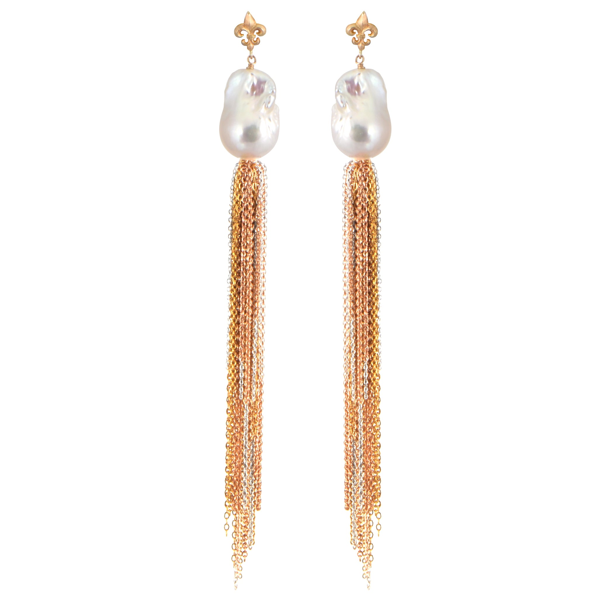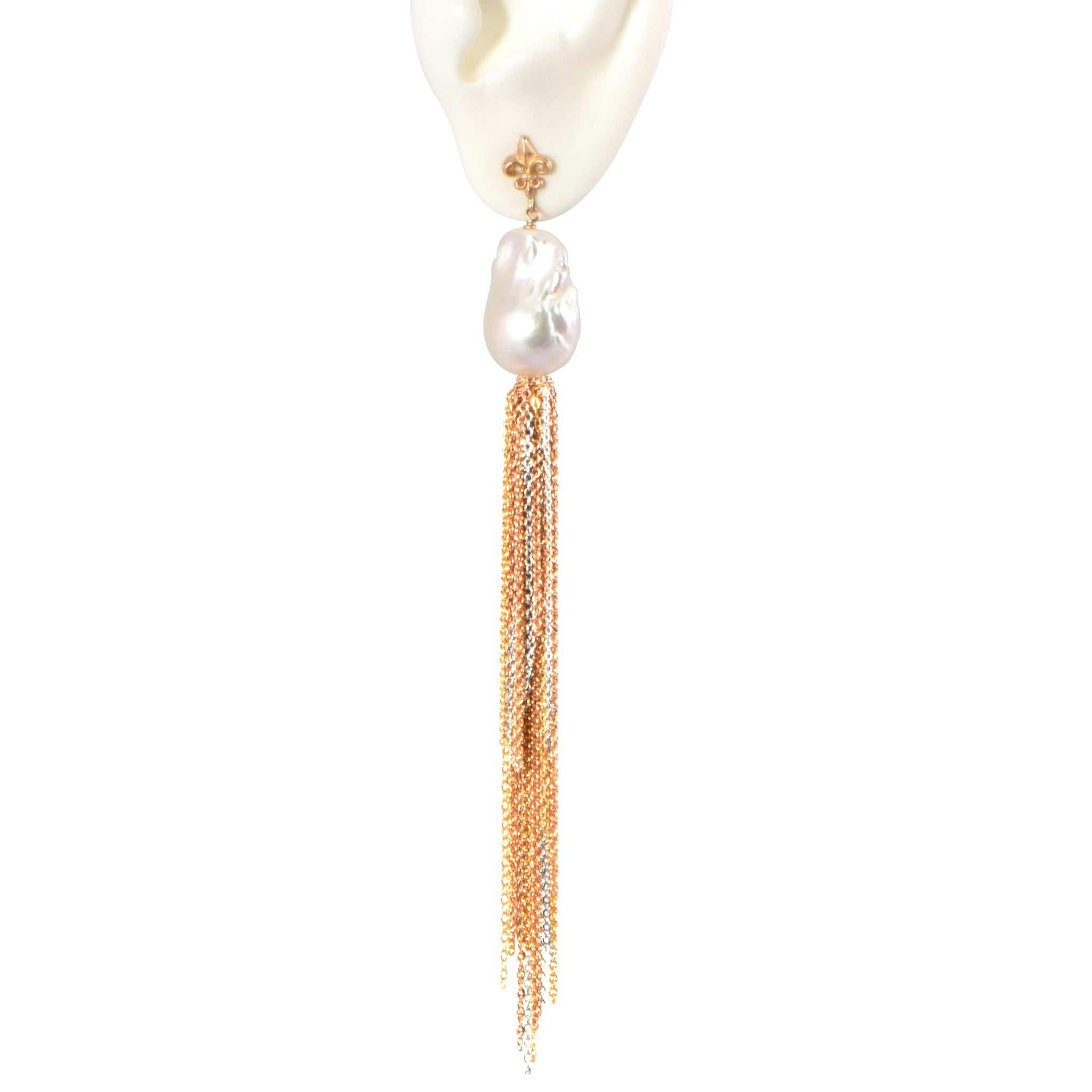 White Baroque Fresh Water Pearl Chain Tassel Fringe Earrings