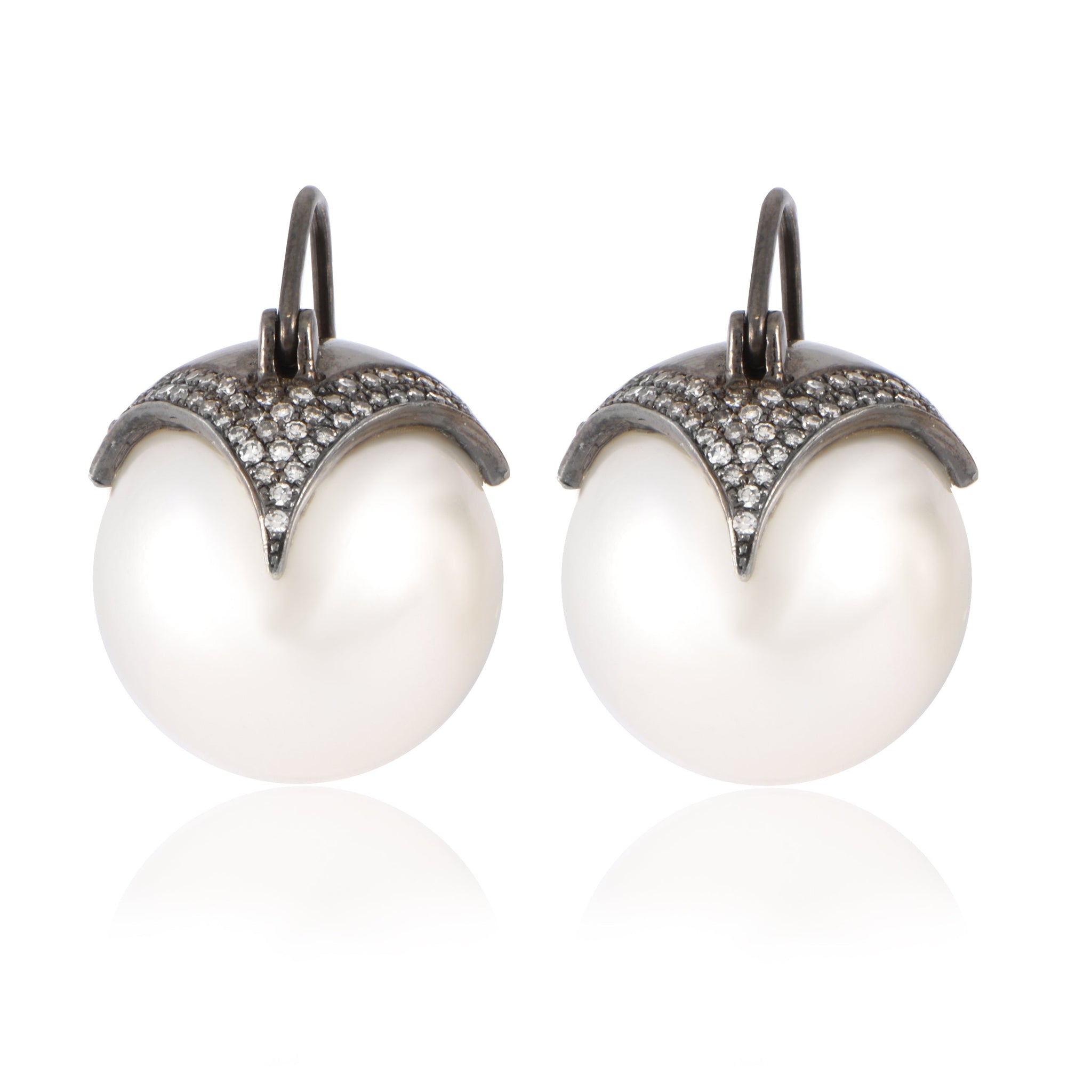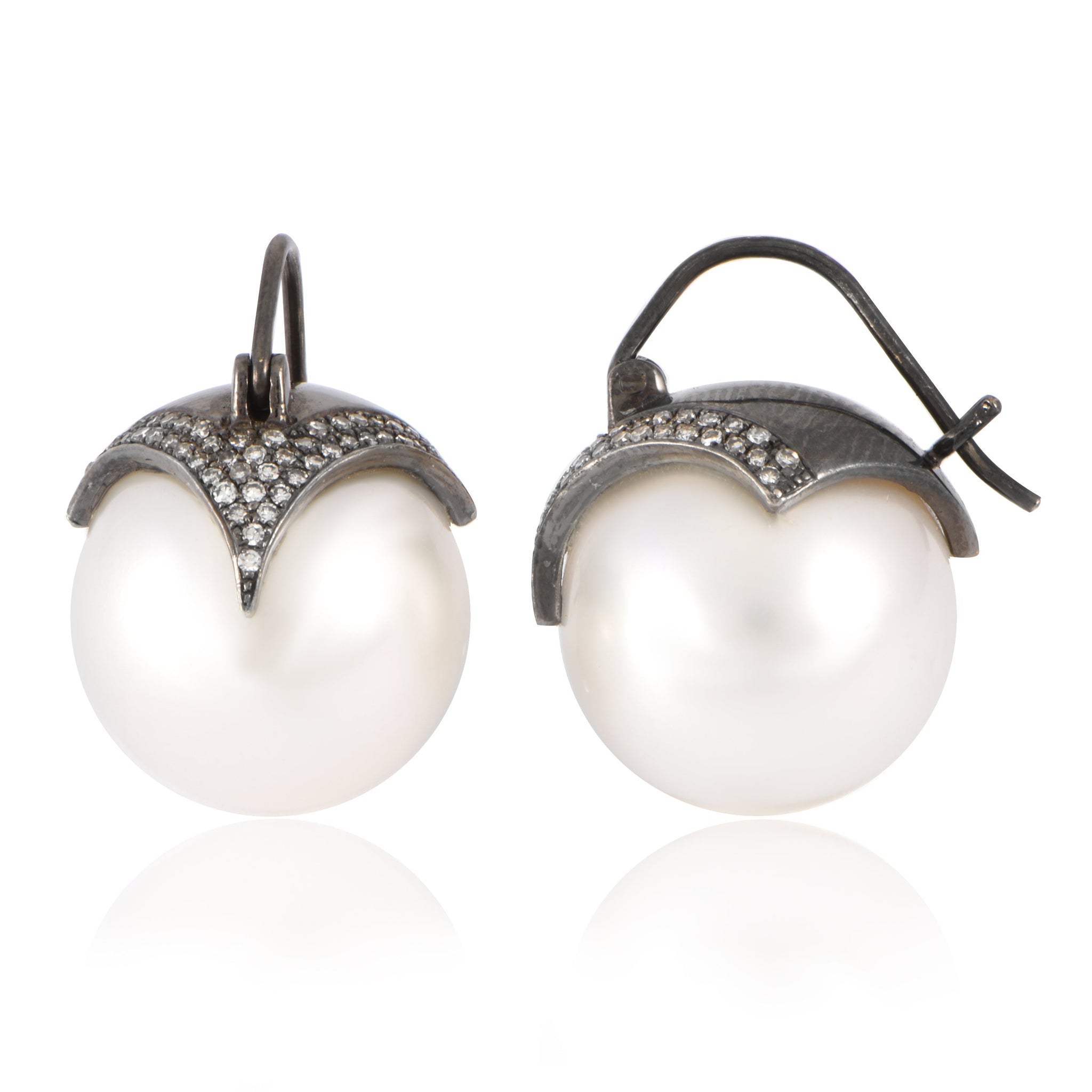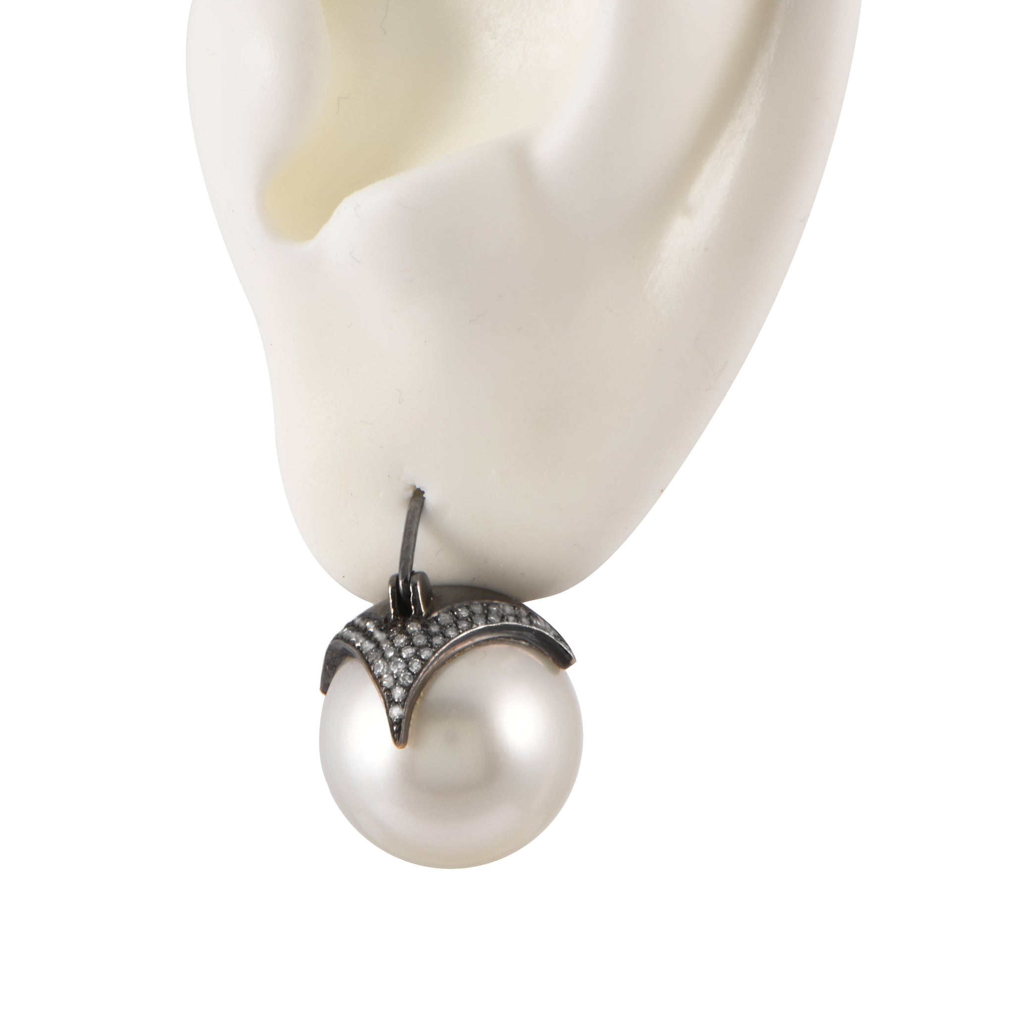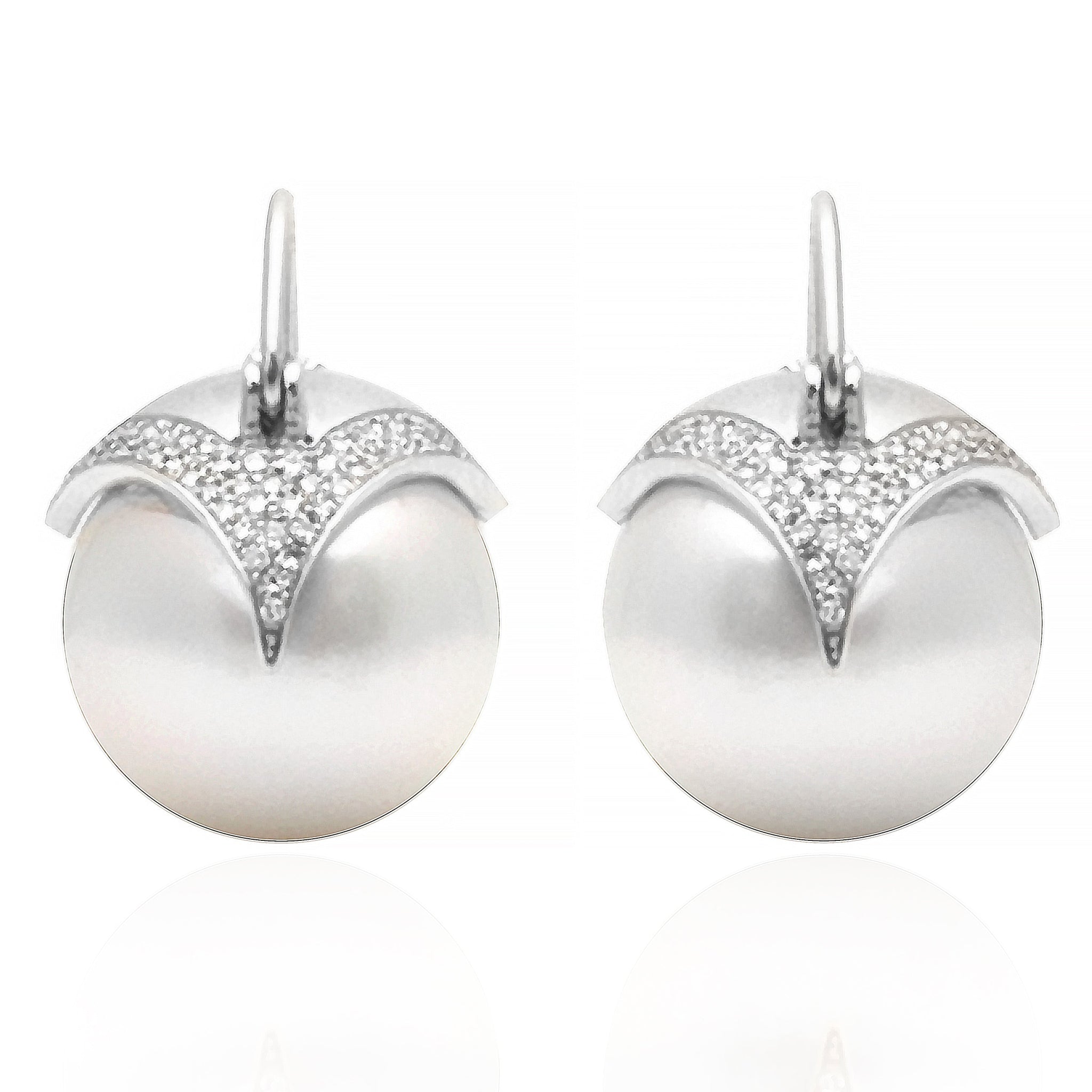 15mm Australian Pearls 18k Yellow Gold Pave Diamond Armor Hook Floating Earrings